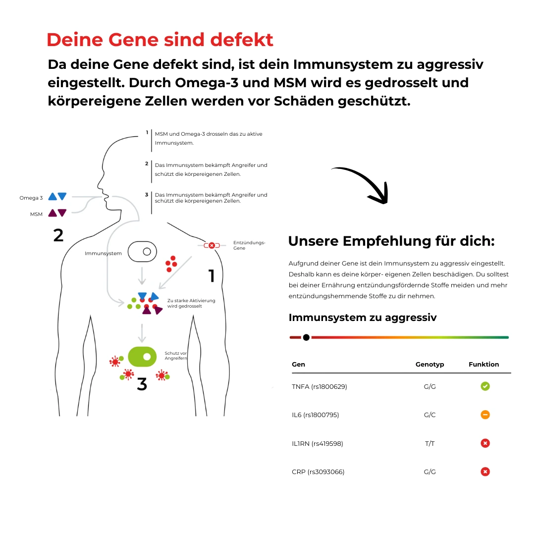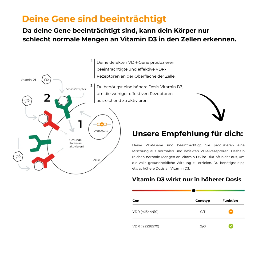 Mit unserer Analyse findest du heraus, wie deine Gene deine Ernährung beeinflussen. Basierend auf den Ergebnissen erstellen wir für dich personalisierte Rezeptvorschläge und bieten dir viele weitere Einblicke, um deine Gesundheit optimal zu unterstützen.
